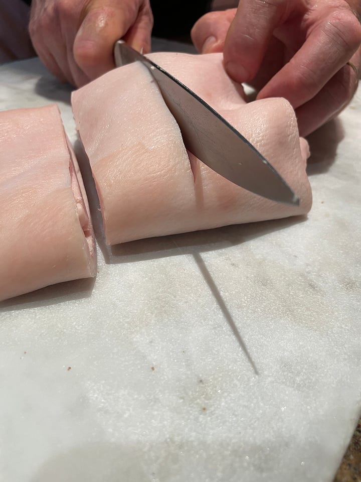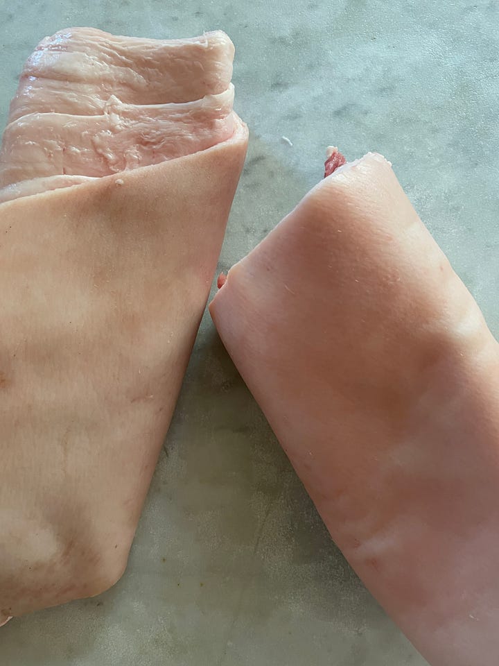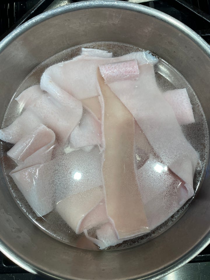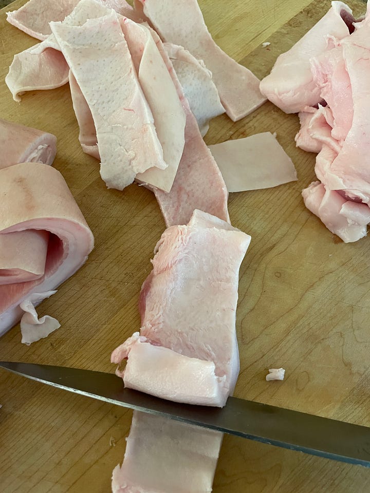 Purchase 2-3 pounds of pig skin from the back or belly of the pig. The amount of skin you will be left with depends on how much fat is left on the inside face of the skin. The following guideline assumes fat of about 1/4 to 3/8 inch. Roll up the skin and slice through to create 2-1/2-inch strips.