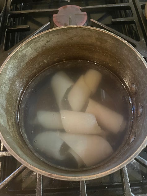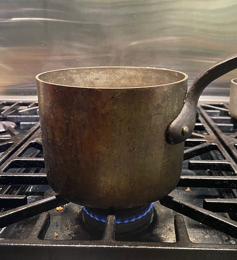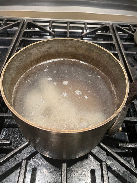 Extracting the collagen: Weigh the skins, place them in a tall, heavy-bottomed sauce pot, and cover them with 8 times their weight in water. The pot must be tall and relatively narrow so that evaporation is minimized. The pot pictured below is 7-1/2 inches wide by 5-1/2 inches tall.