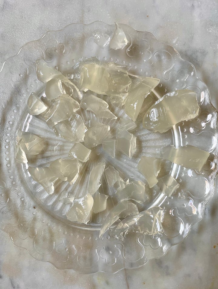 Gelatin is made from collagen protein, which is found in the skin, bones, and connective tissues of animals. When heated in water, collagen fibers are released, soak up the water, and begin to swell. With continued heating, collagen forms a tangle of connections, trapping water and, upon cooling, becomes a semi-solid gel. Dried versions of collagen protein come as powders like the brand Knox or in “leaves” of different bloom strengths (capacities to gel liquids) to which they are added. Of course, these expediencies were not available to the medieval cook, nor were those based on plant-based gelatin from seaweed such as agar-agar or carrageenan. In a nod to the old versions, the recipe below calls for making your own gelatin.
