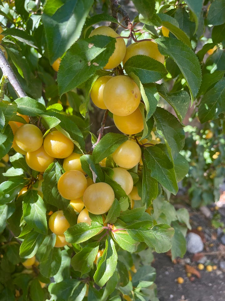 The wild plums on my hill belong to the Prunus genus but I have yet to identify them. The first and most prodigious of my trees yields small yellow fruit resembling a cherry in size that is yellow with a faint blush when ripened in the sun. The other tree bears larger fruit, 1-1/2 to 2 inches in diameter with meaty flesh.